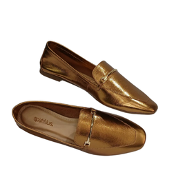 Um Loafer feminino sofisticado em acabamento metalizado bronze em couro , que transmite elegância e modernidade. Seu design de bico quadrado é valorizado pelo detalhe minimalista em metal na parte superior, garantindo um toque refinado. Versátil e estiloso, é o calçado ideal para quem busca conforto aliado a um visual marcante.