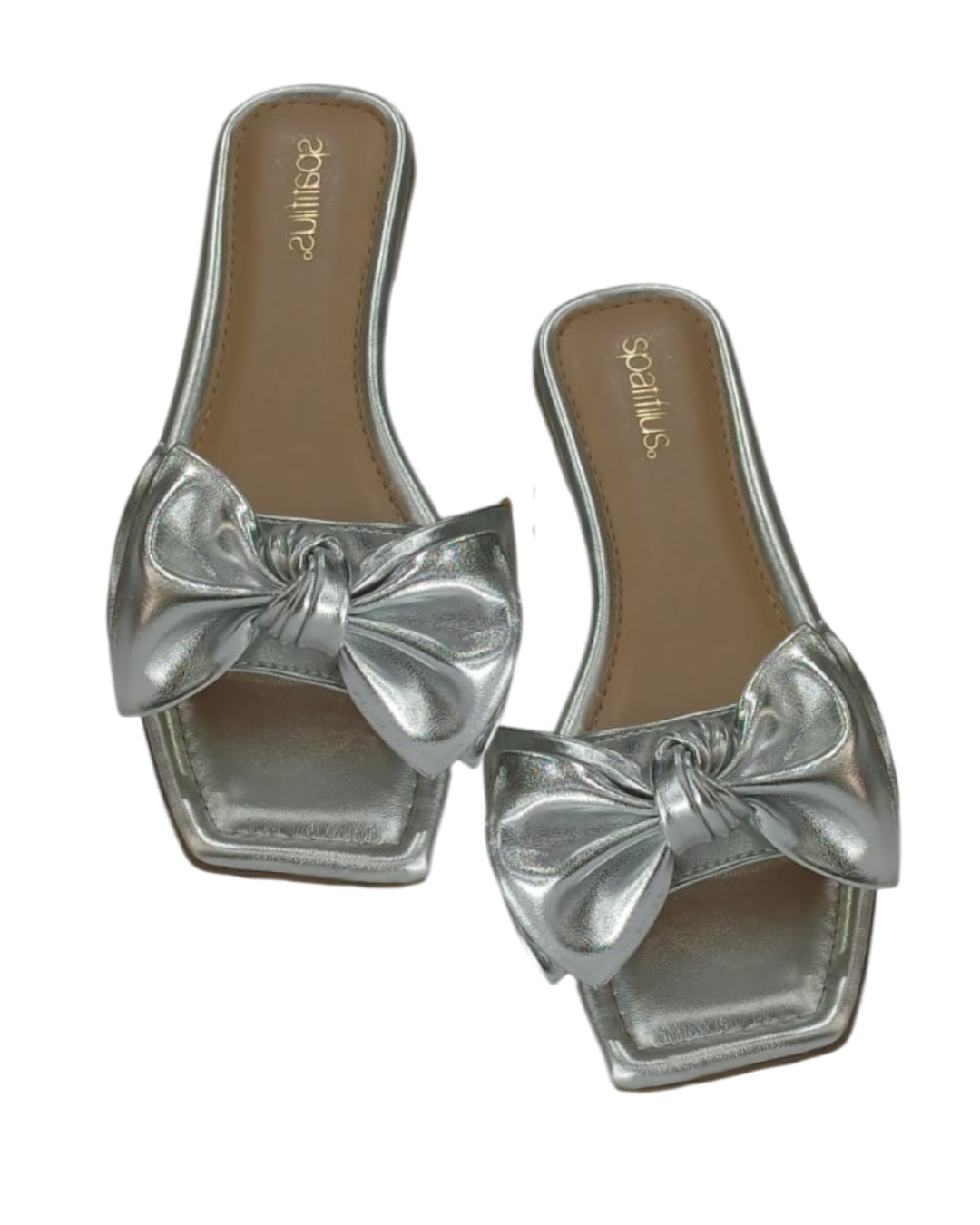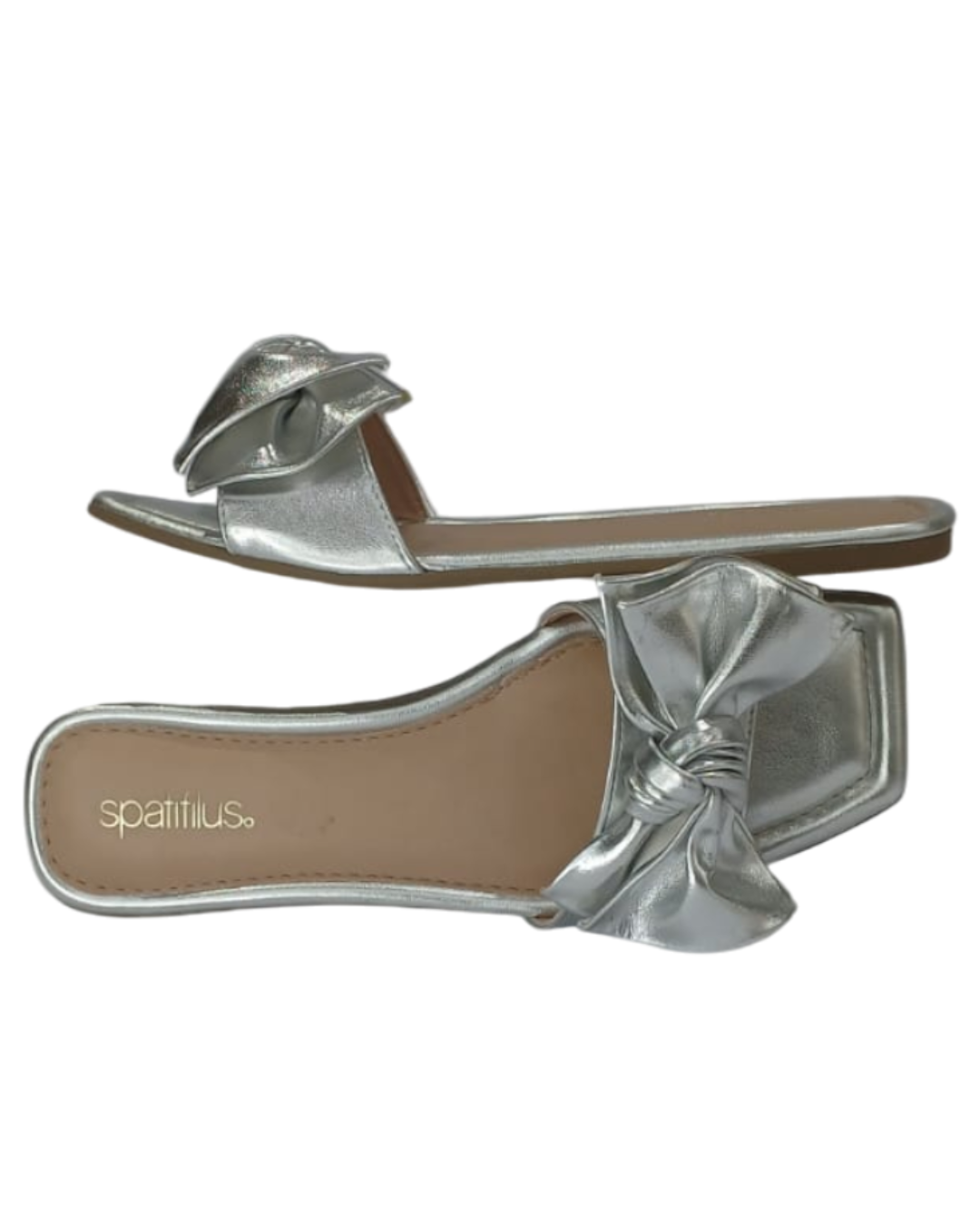 Essa rasteira Spatifilus em acabamento metalizado prata é a escolha ideal para quem deseja iluminar o look com elegância e feminilidade. O destaque fica por conta do laço estruturado na parte frontal, que traz charme e um toque romântico à composição, sem perder a modernidade.
