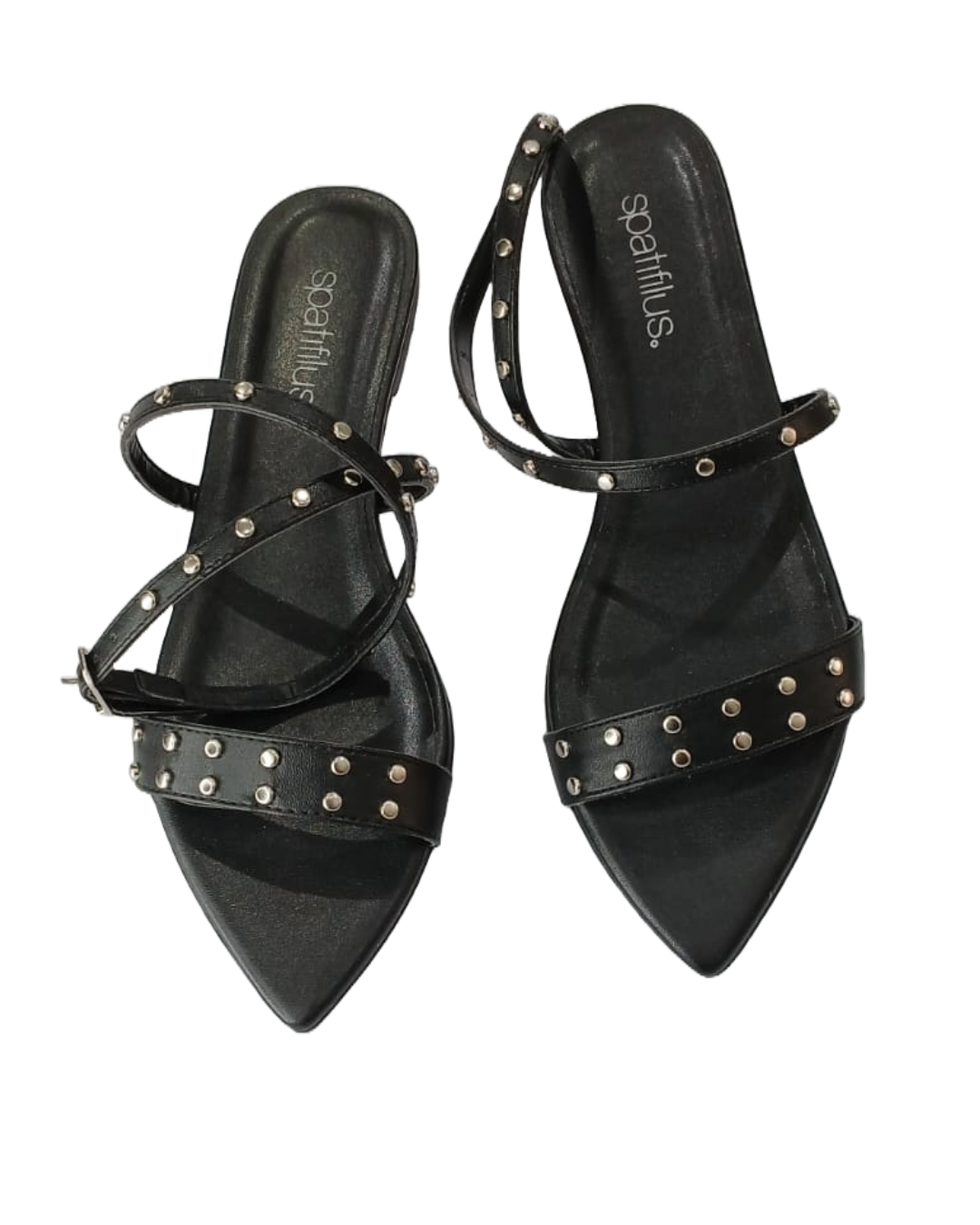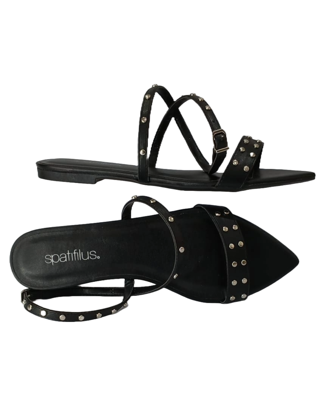 Suas tiras delicadas com aplicações de tachas douradas trazem um toque de modernidade e sofisticação, equilibrando o estilo clássico com um ar ousado. O fechamento ajustável garante conforto e segurança ao caminhar, sem abrir mão da leveza.