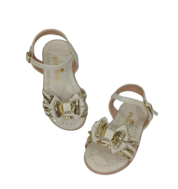 Essa é uma sandália infantil elegante em tom claro, com laços delicados adornados em pedrarias douradas que trazem sofisticação e brilho ao visual. Confortável e cheia de charme, é ideal para ocasiões especiais, deixando cada passo das pequenas ainda mais encantador. ✨👧🎀