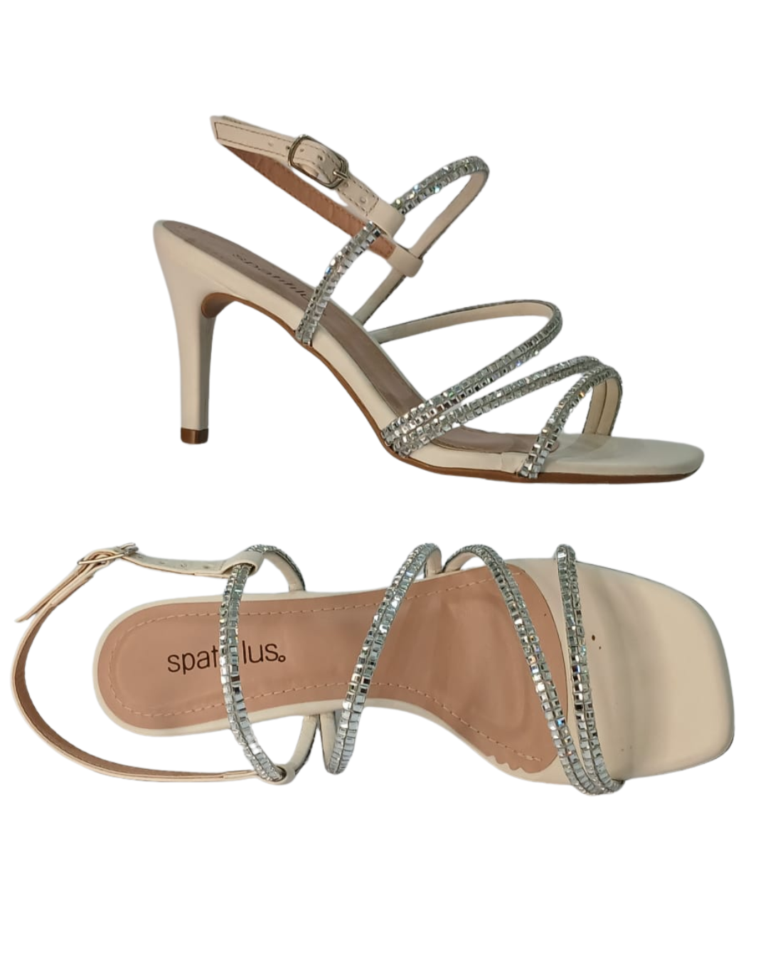 Esta sandália celebra o glamour de festa com um design que exala sofisticação. No tom delicado de off-white cremoso, o modelo combina um salto alto fino e elegante com a modernidade da biqueira quadrada sutil. O verdadeiro destaque são as múltiplas tiras finas, ricamente cravejadas de strass, que se entrelaçam no peito do pé e tornozelo, criando um efeito cintilante e leve. Esta peça é perfeita para noivas, formandas e qualquer evento que exija um calçado deslumbrante, que una a feminilidade do brilho à elegância da cor neutra.