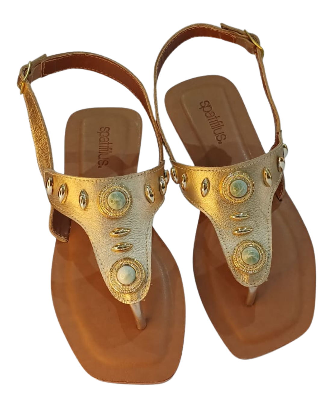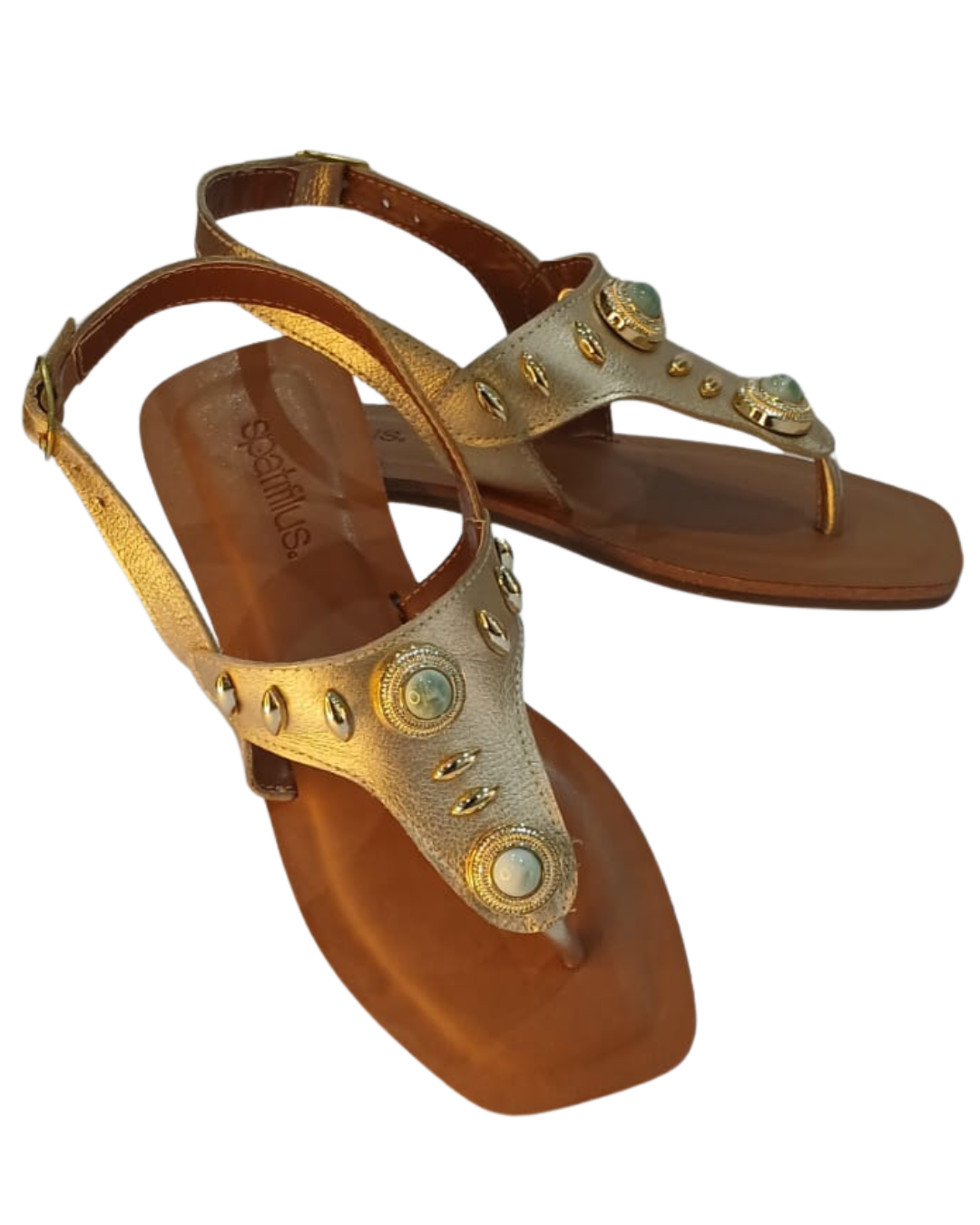 Esta rasteira de dedo, com alça de calcanhar, exala um glamour étnico e solar. O corpo do calçado é trabalhado em couro dourado metalizado, contrastando elegantemente com a palmilha caramelo. O destaque reside na tira em formato de “T”, que é ricamente ornamentada com pedrarias ou resinas ovais em tons esverdeados ou turquesa, ladeadas por pequenos detalhes metálicos, criando um visual vibrante e sofisticado para o dia a dia.