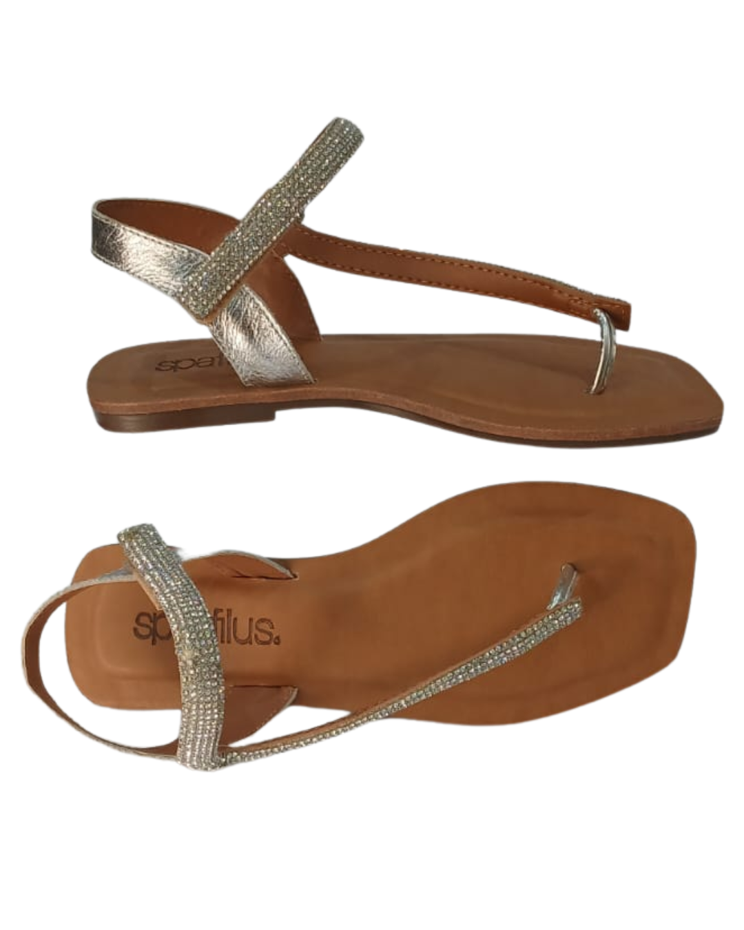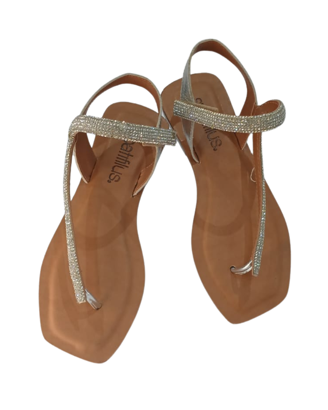 Esta sandália rasteira exala sofisticação com seu design delicado e toque de brilho. As tiras finas adornadas com pedrarias refletem a luz com sutileza, criando um efeito elegante e feminino. Ideal para quem busca conforto sem abrir mão do charme e da modernidade.