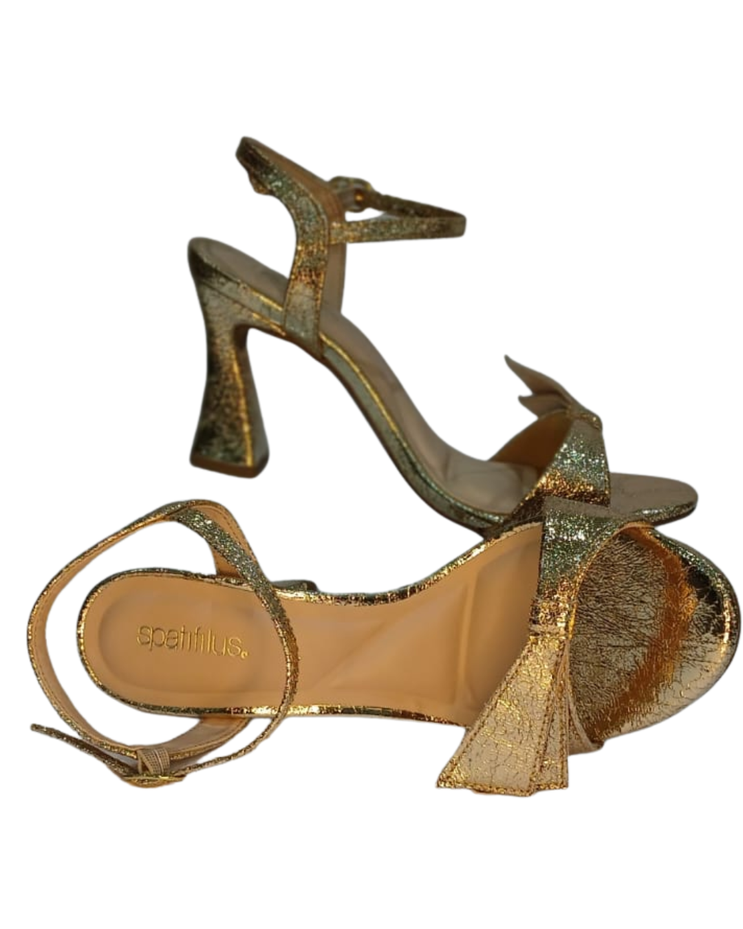 Esta sandália dourada Spatifilus é a tradução do luxo moderno. Seu acabamento texturizado adiciona um toque de exclusividade, enquanto o salto taça garante charme e conforto em perfeita harmonia. Ideal para ocasiões especiais, ela eleva qualquer produção com sutileza e sofisticação. Um calçado que reflete o brilho e a confiança da mulher Spatifilus.