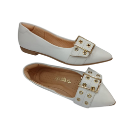 Um sapato feminino elegante em tom branco, com design de bico fino que transmite sofisticação. O detalhe marcante fica por conta do maxi cinto com fivela dourada e aplicações de ilhós, trazendo um toque moderno e sofisticado ao modelo. Perfeito para compor looks versáteis que vão do dia a dia a ocasiões especiais com estilo refinado.