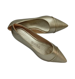 Um sapato feminino em tom dourado sofisticado, com design de bico fino que alonga a silhueta e valoriza o visual. O detalhe texturizado na parte frontal adiciona um toque moderno e elegante. Ideal para compor produções refinadas, é uma escolha versátil que combina conforto e estilo.