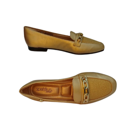 Esse mocassim dourado combina modernidade e sofisticação em um design elegante. O detalhe em corrente metálica na parte frontal traz um toque de luxo, enquanto o acabamento em textura sutil valoriza ainda mais o modelo. Versátil e confortável, é a escolha ideal para compor looks refinados tanto no dia a dia quanto em ocasiões especiais.