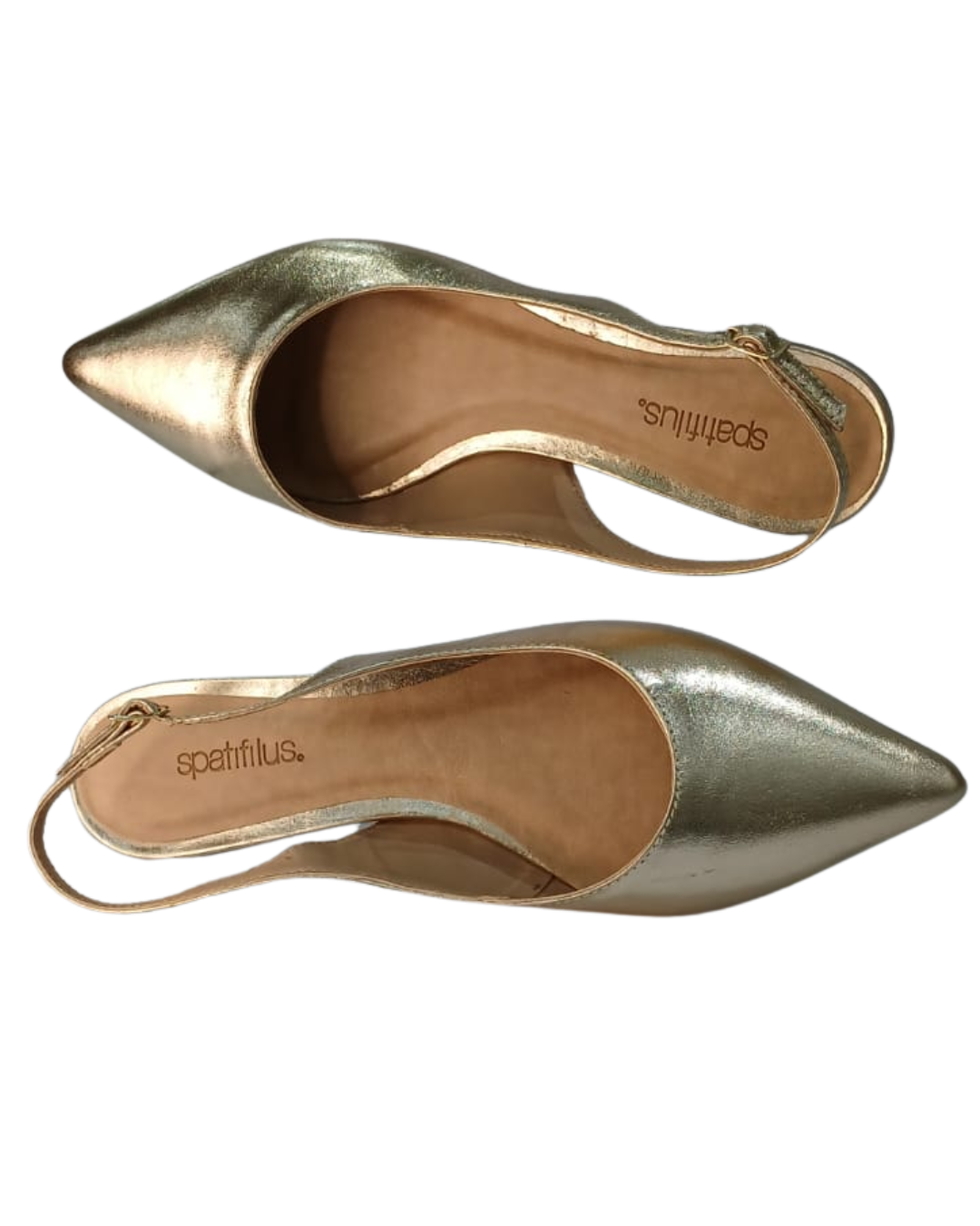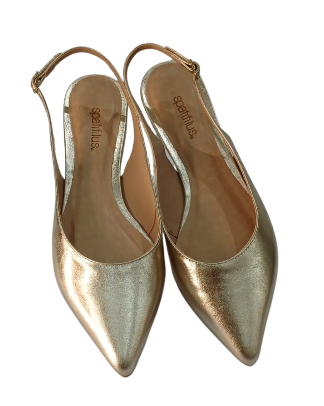 Este é um par de sapatilhas slingback de bico fino no tom dourado metalizado, com um acabamento brilhante e liso por toda a superfície, apresentando uma tira fina e ajustável no calcanhar e um salto extremamente baixo (flat), sendo uma opção elegante e festiva para adicionar um ponto de luz e sofisticação a qualquer conjunto.
