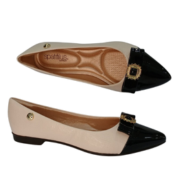 Esta sapatilha de bico fino combina um design moderno e elegante com o clássico contraste do preto e off . A peça se destaca pelo laço no peito do pé, que é adornado com uma pedraria sofisticada, adicionando um toque de brilho e luxo. É o calçado ideal para quem busca versatilidade e estilo, podendo ser usado tanto em ocasiões casuais quanto em eventos mais formais.