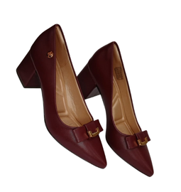 Apresentamos a peça perfeita para um visual sofisticado: este sapato de bico fino na cor vinho. O tom rico e elegante é complementado por um laço com detalhe dourado na parte superior, que adiciona um toque de feminilidade e luxo. O salto bloco oferece a altura ideal com total conforto e estabilidade, perfeito para o escritório, eventos noturnos ou qualquer momento em que você queira impressionar. Este sapato é a definição de estilo e bom gosto.